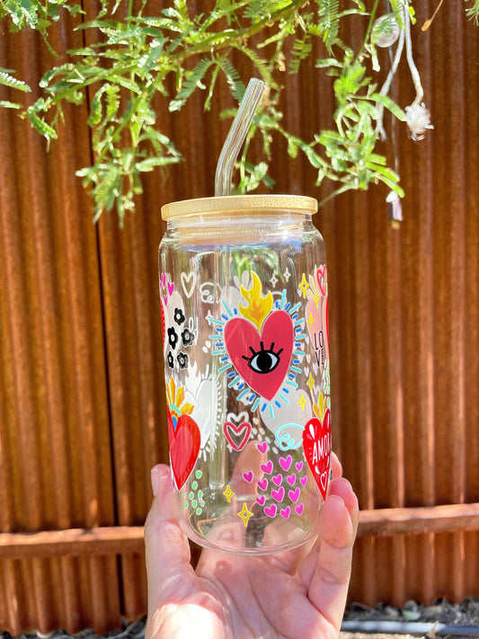 Sacred Heart Design with Love & Amor | 16 oz Glass Cup with Bamboo Lid & Straw