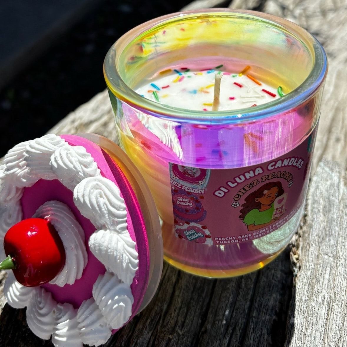 Custom 13oz candle made for our local bakery, Chez Peachy!