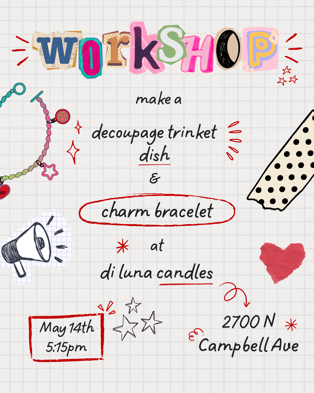 Join us and make a decoupage trinket tray and a charm bracelet. All materials provided and guided instruction.