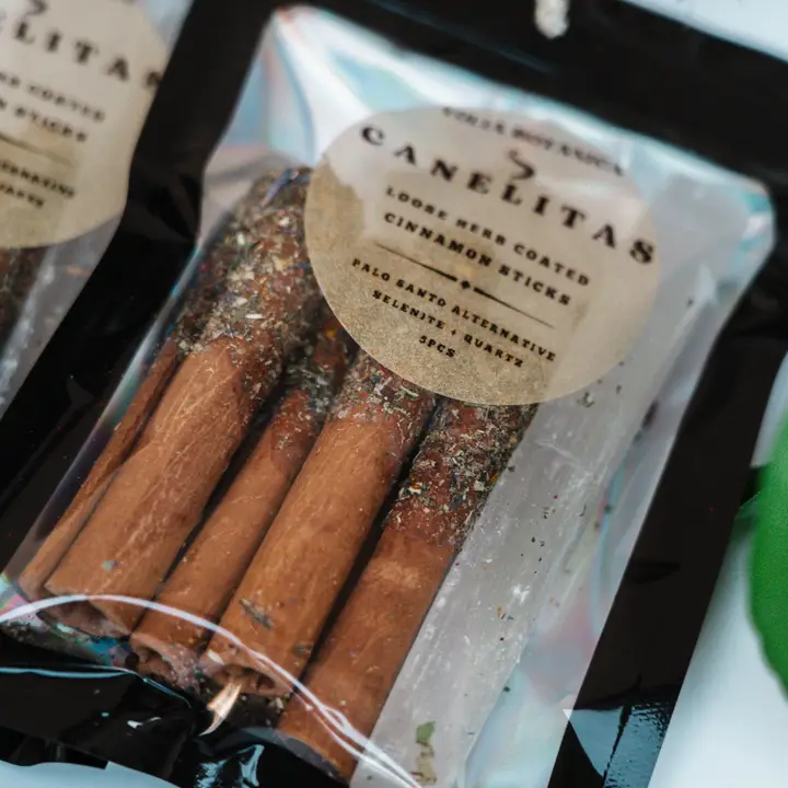 Canelitas are dipped in 100% organic soy wax with premium fragrance to enhance scent. Each bag contains 5 canelita sticks, 1 selenite stick and 1 Brazilian clear quartz