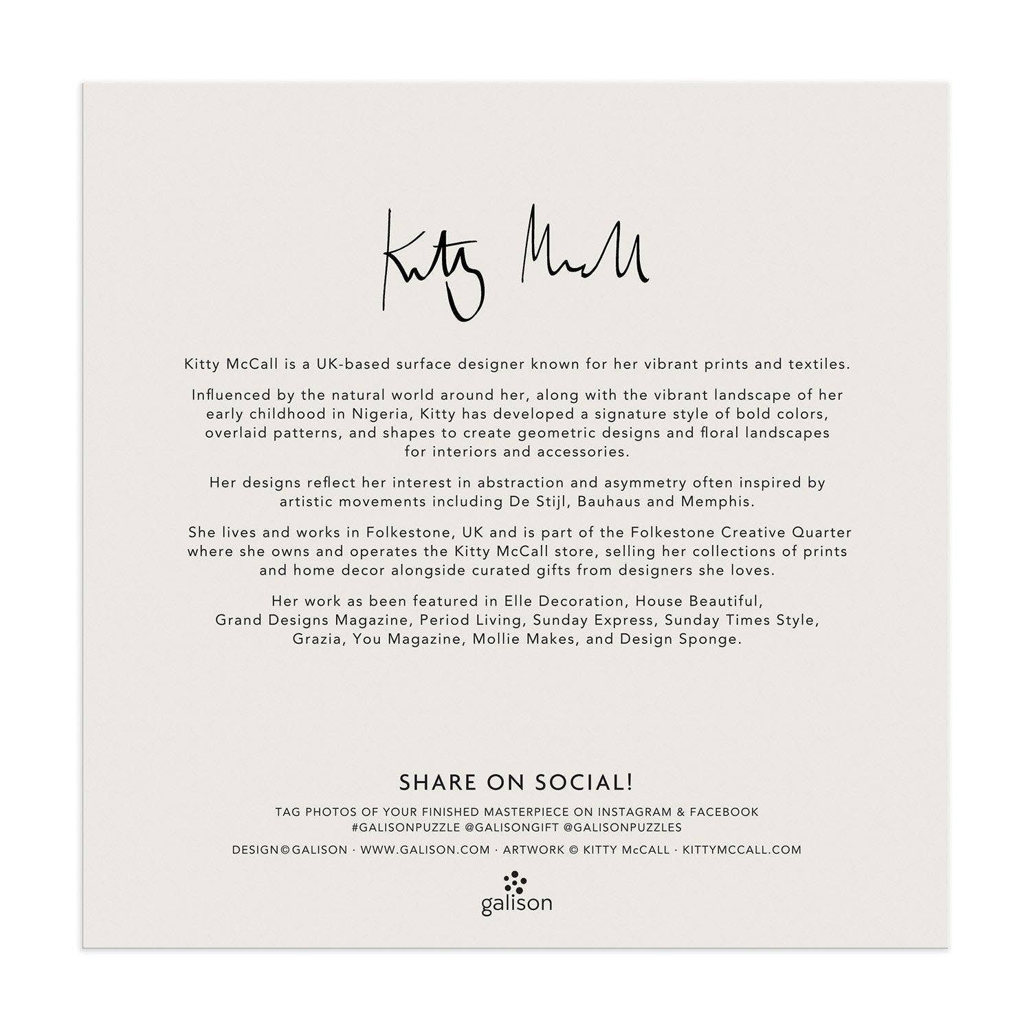 The Lost In the Garden 500 Piece Puzzle features the colorful floral artwork of Nigerian-born, UK-based artist, Kitty McCall. Influenced by the natural world around her, along with the vibrant landscape of her early childhood in Nigeria, Kitty McCall has developed a signature style of bold colors, overlaid patterns, and shapes to create geometric designs and floral landscapes for interiors, and accessories. Galison puzzles are packaged in matte-finish sturdy boxes, perfect for gifting, reuse, and storage. An insert of the full puzzle image is also included.