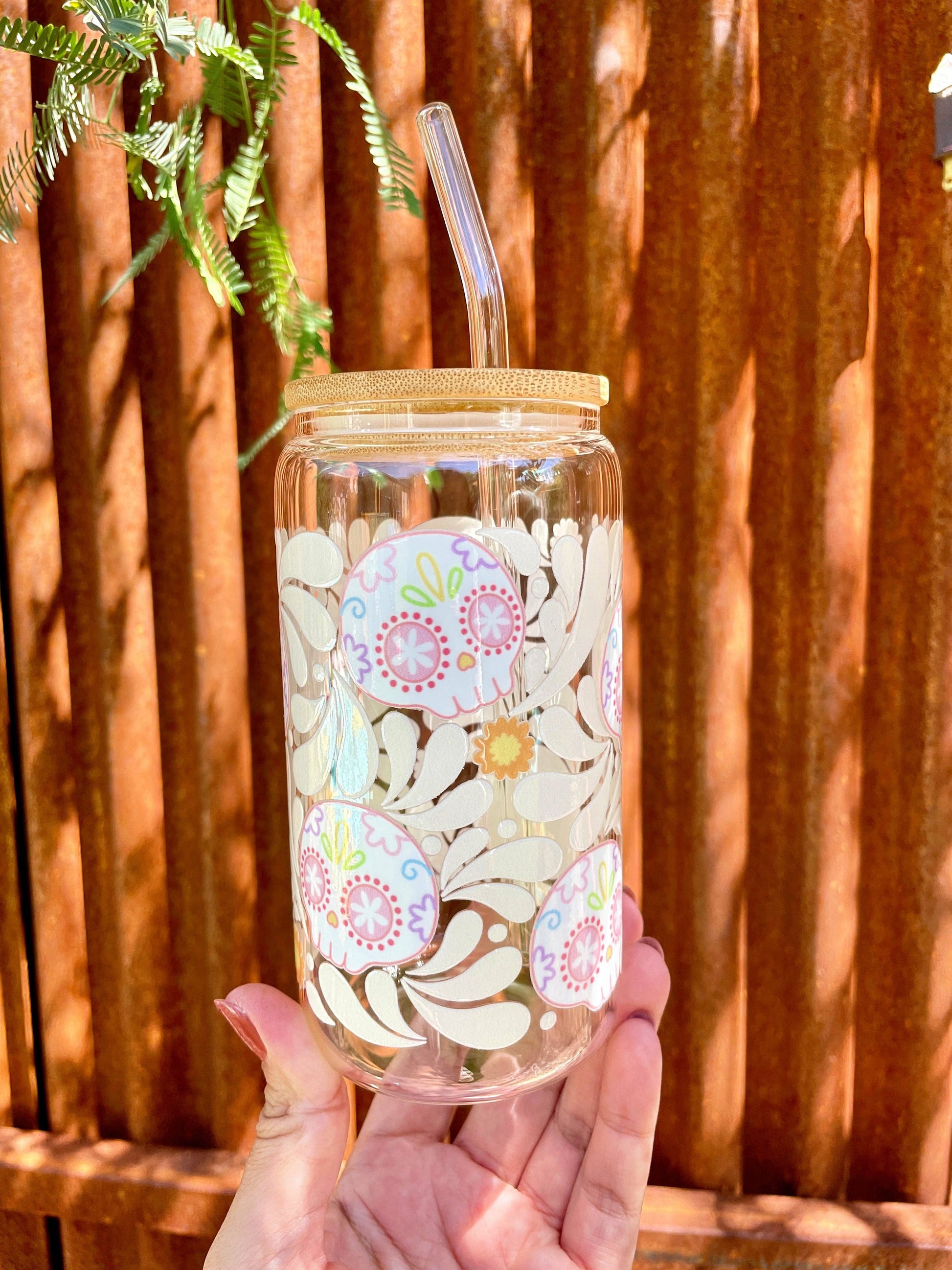 Add a vibrant touch to your drinkware collection with this beautifully crafted Libbey glass cup, adorned with colorful sugar skulls and traditional Talavera-inspired patterns. Perfect for sipping your favorite beverages in style, this cup brings a festive, artistic flair to any occasion.