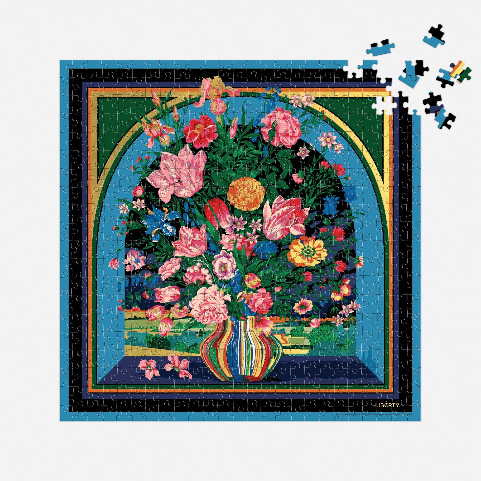 The Liberty Vista 500 Piece Book Puzzle features Liberty’s Vista print, a hand painted scene depicting a view through a window with a floral bouquet at the center. This book shaped keepsake box with magnetic closure features Liberty’s Heirloom print, a dense and rich botanical illustration reworked from a Liberty archive painting, full of chrysanthemums, marguerites, tulips and daffodils.