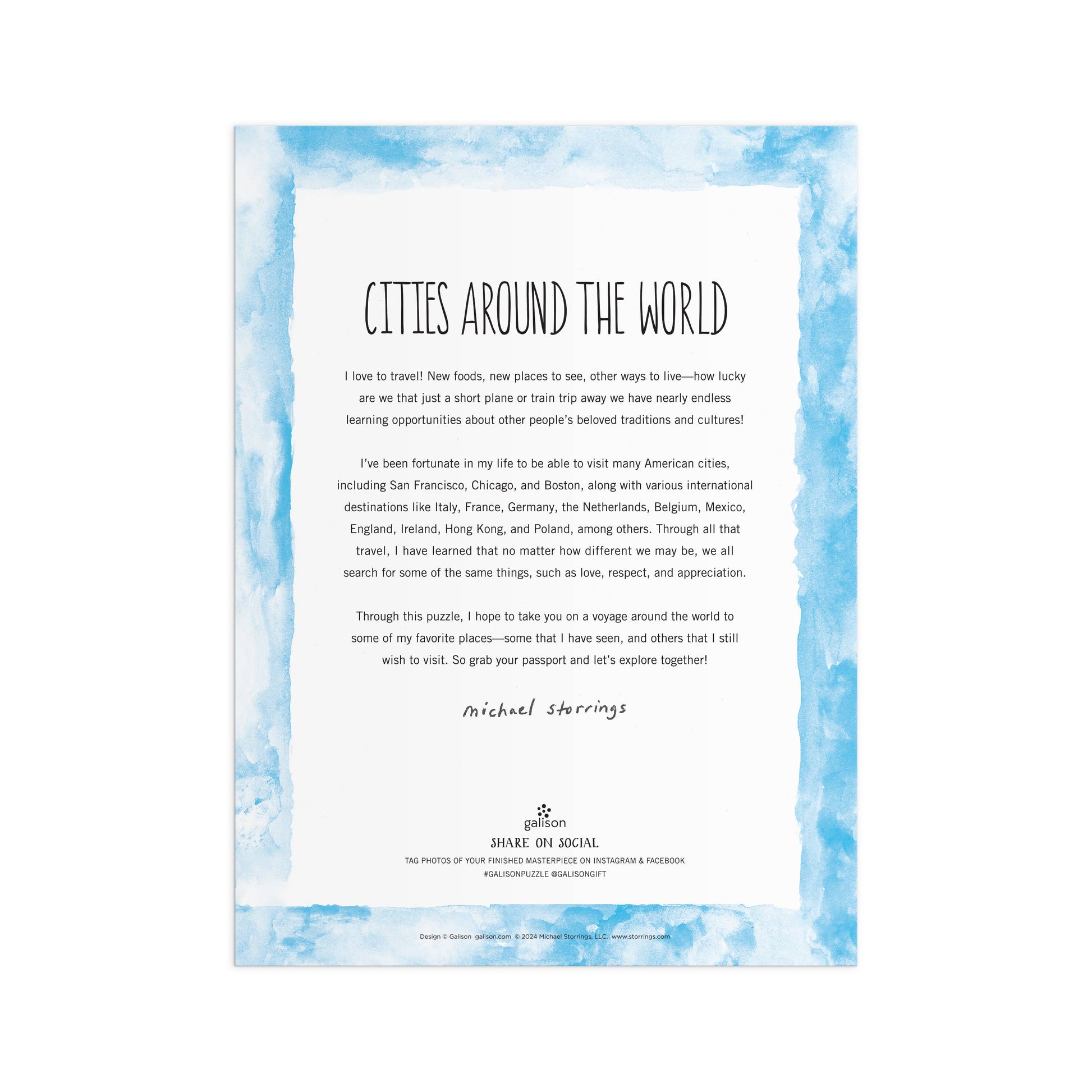 1000 PIECE PUZZLE – Embark on a captivating journey across the globe with Galison's stunning 1000-piece puzzle featuring the vibrant artwork of Michael Storrings showcasing cities around the world. Each piece of this puzzle is a window into the bustling streets, iconic landmarks, and diverse cultures of some of the world's most beloved destinations. As you unravel the puzzle's intricacies, feel the sense of accomplishment with each fitting piece, and witness the scene come to life before your eyes