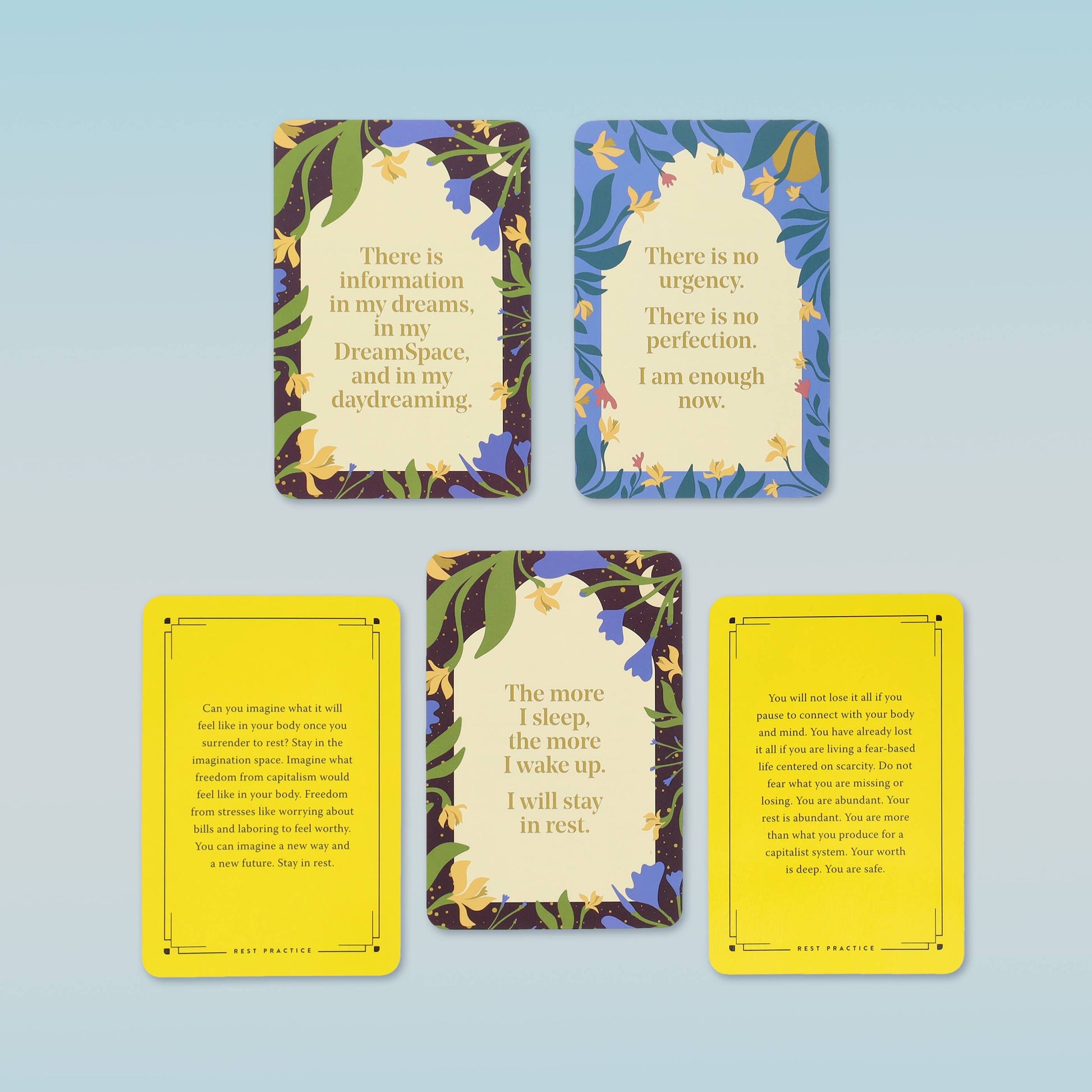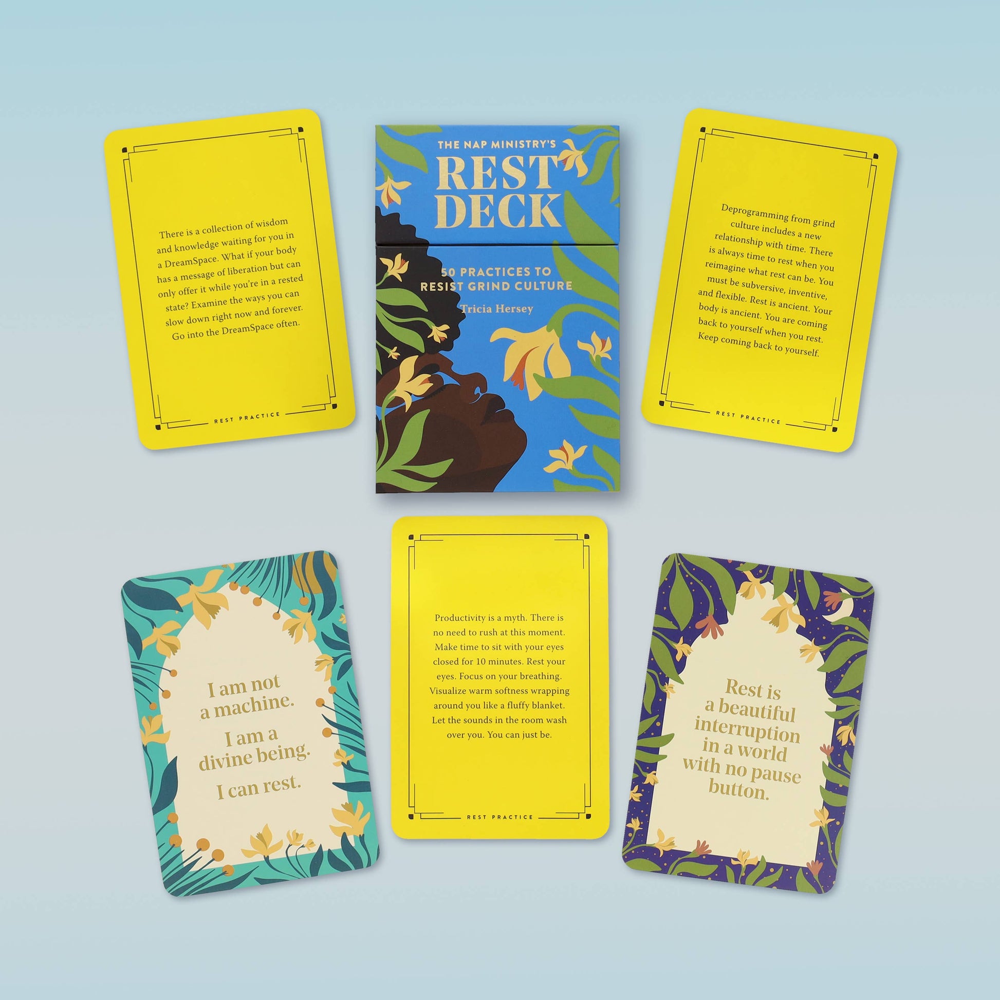 The Nap Ministry's Rest Deck is a rousing call to reclaim rest in everyday life. Delivered in a stunning package with gold accents and gorgeous artwork throughout, the deck combines restorative meditations with prescient wisdom from celebrated activist and teaching artist Tricia Hersey, a.k.a. "the Nap Bishop," and founder of the Nap Ministry.