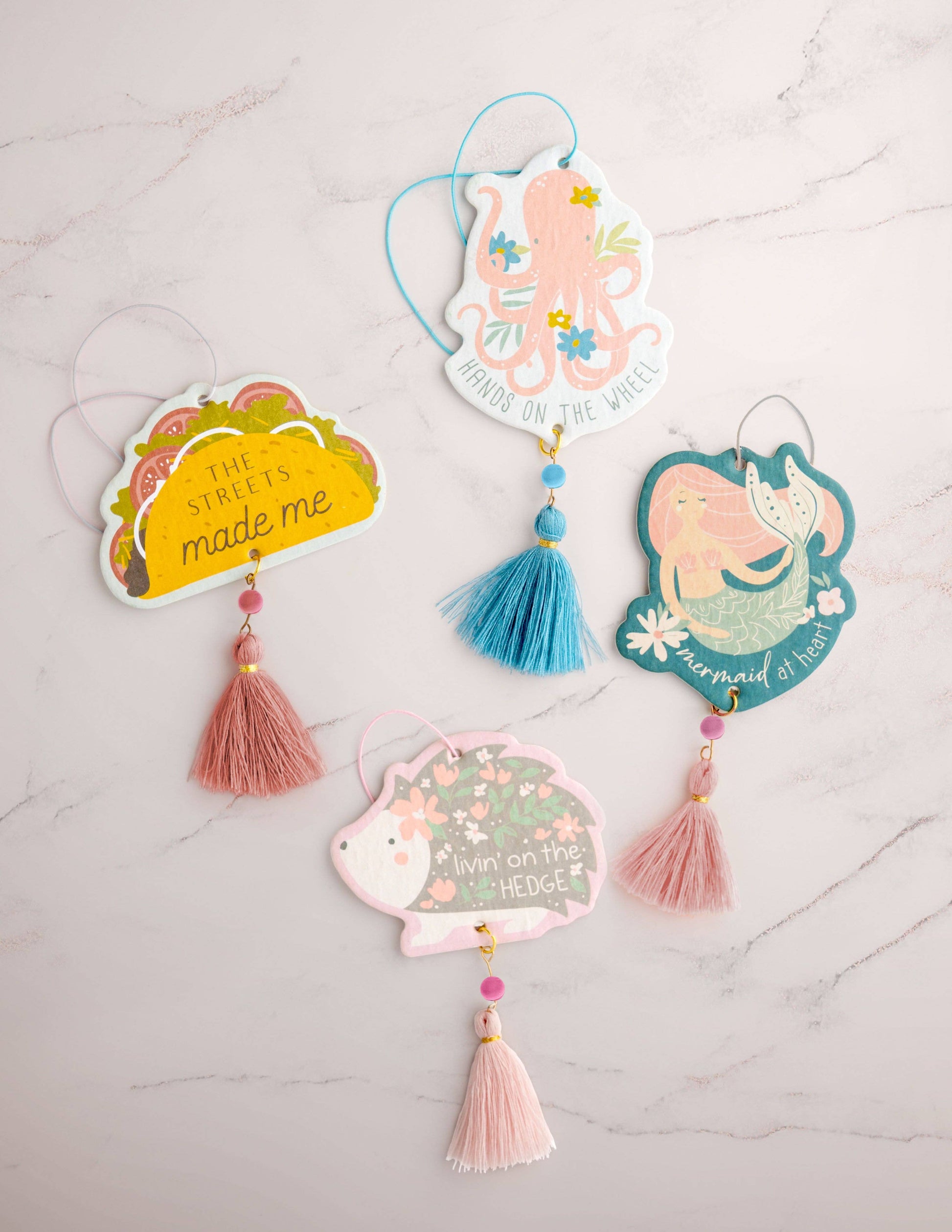 Our Shaped Air Fresheners are the perfect travel accessories that give color and serve function in your car. Diffuse the delightful smells of coconut, jasmine, lavender, vanilla, and sandalwood into your car for yourself and others to enjoy. Each air freshener features vibrant art with modern illustrations, as well as a colorful tassel and frosted bead for an added thoughtful detail.